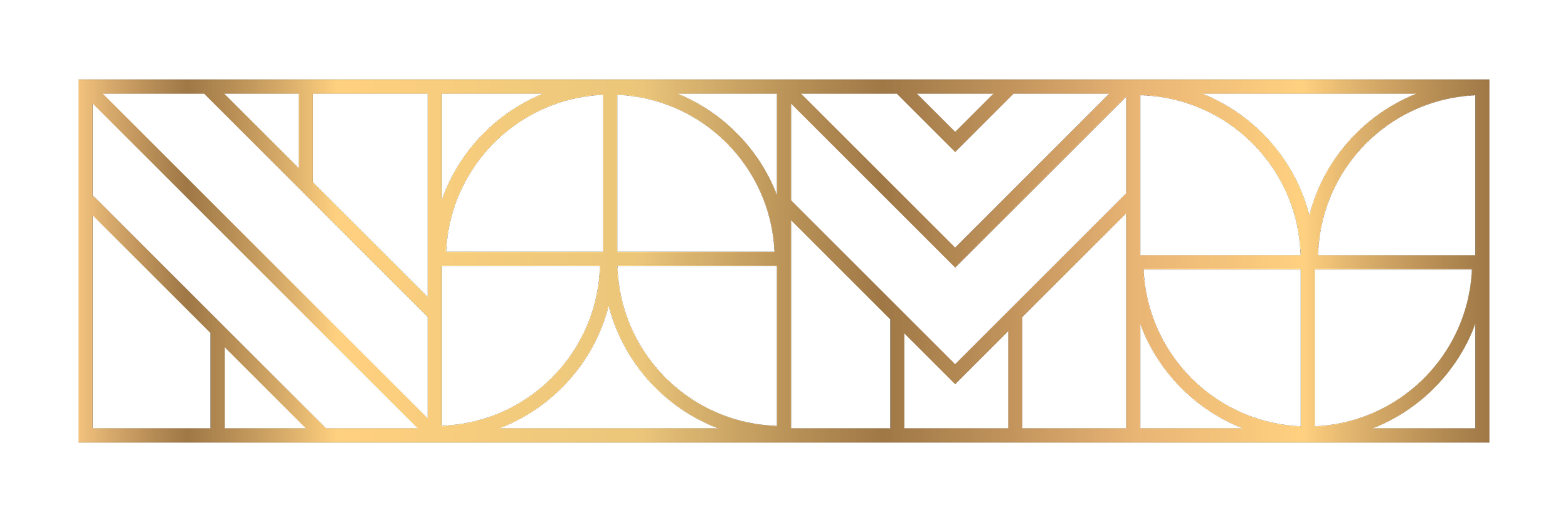 Gold or golden geometric abstract pattern with various shapes and lines. Spells NAMU.